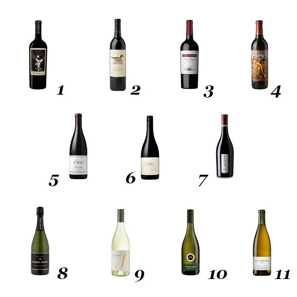 1: The Prisoner Red Blend ($44) / 2: Decoy by Duckhorn Cabernet ($18) / 3: Louis Martini Cabernet (Sonoma – $15 or Alexander Valley – $29) / 4: Michael David Cabernet Freakshow ($16) / 5: Etude Pinot Noir Carneros ($37) / 6: Lyric by Etude Pinot Noir ($19) / 7: Elouna Pinot Noir / 8: Mumm Napa Brut Prestige ($17) / 9: J Vineyards Pinot Gris ($13) / 10: Kim Crawford Sauvignon Blanc ($11) / 11: La Crema Chardonnay ($13)